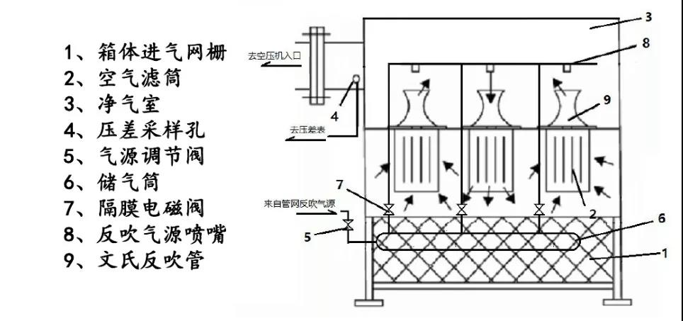 返回列表脈沖反吹自潔式空氣過濾器的主要部件包括:空氣濾筒、脈沖反吹系統、凈氣室、框架、控制系統。反吹系統由氣動隔膜閥、電磁閥、專用噴嘴及壓縮空氣管路組成。控制系統主要由脈沖控制儀、差壓變送器、控制電路等組成。其結構如圖所示。