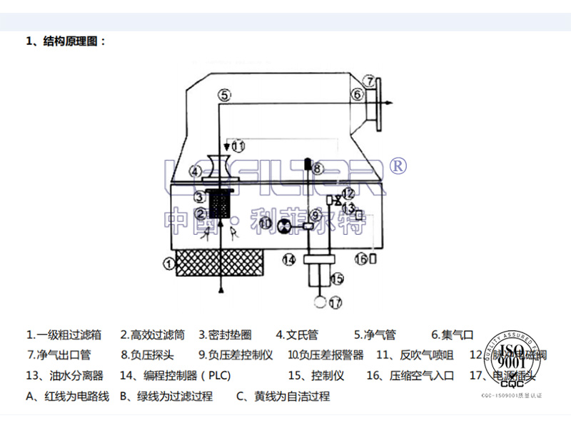 過濾過程: 含塵空氣經(jīng)空氣壓縮機吸氣作用,從一級粗過濾箱①吸入,經(jīng)過高效過濾筒②,由于重力慣性、擴散、接觸阻留等綜合作用,塵埃被吸附在高效過濾筒上,潔凈空氣通過密封墊圈③進入文氏管④到凈氣室⑤匯合到集氣口⑥再從凈氣出口管⑦被空壓機吸入。